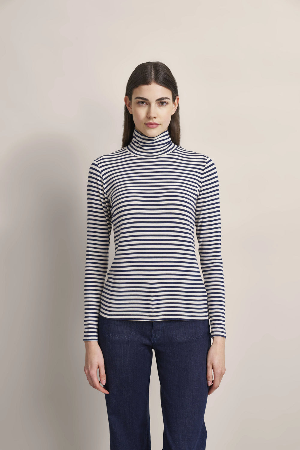 Gestreiftes Rollkragenshirt in Blau-Weiß, Modelbild, entspanntes Posing.