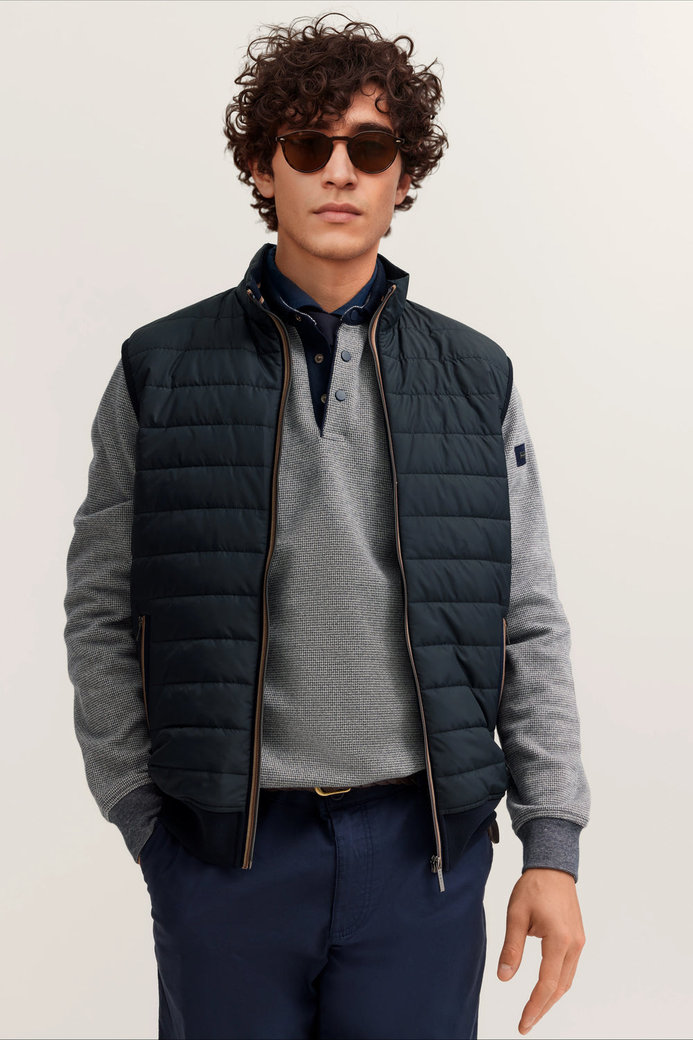 Model in blauer Steppweste, grauem Pullover und blauer Chinohose von bugatti, entspanntes Posing.